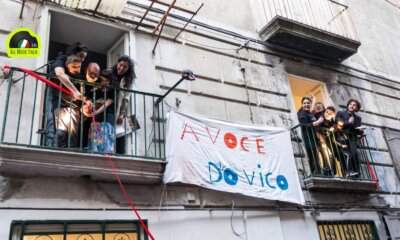 Anastasio canta dai balconi del Vicolo della Cultura in una serata curata da Putéca Celidònia.
