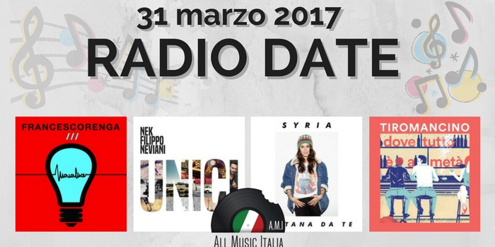 Appuntamento settimanale con il radio date. Il 31 marzo i nuovi singoli di Nek ft J-Ax, Syria, Francesco Renga, Tricarico e tutti gli altri.