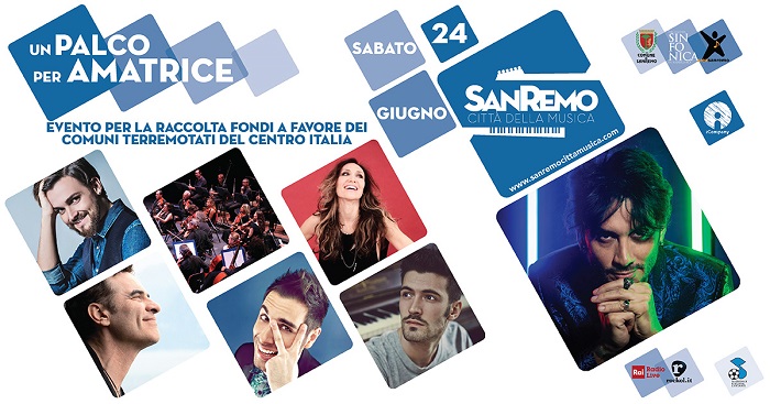 Il 24 giugno a Sanremo la serata-evento "Un palco per Amatrice" col live di Fabrizio Moro e la partecipazione di Marina Rei, Valerio Scanu, Francesco Baccini, Giovanni Caccamo e Antonio Maggio.