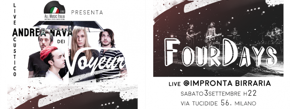 All Music Italia è lieta di invitarvi il 3/09 al concerto dei FourDays e di Andrea Nava dei Voyeur (in acustico) a Milano. Ingresso libero.
