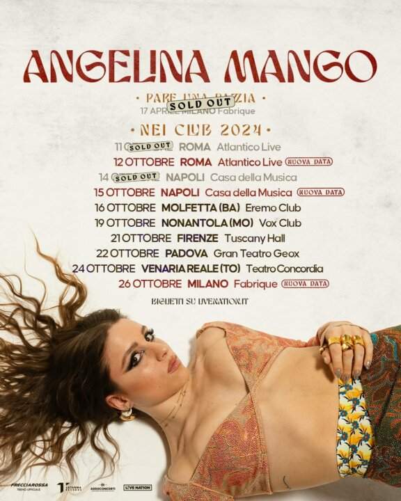 Nel mentre, dopo il tutto esaurito del concerto-evento “Pare una Pazzia” e il raddoppio con nuova data il 26 ottobre 2024, la giovane cantautrice annuncia il sold out della data a Napoli (14 ottobre, Casa della Musica) e a Roma (11 ottobre, Atlantico) del tour autunnale “Angelina Mango nei club 2024”, prodotto e organizzato da Live Nation, e raddoppia l’appuntamento con due nuovi live il 12 ottobre 2024 a Roma e il 15 ottobre 2024 a Napoli.