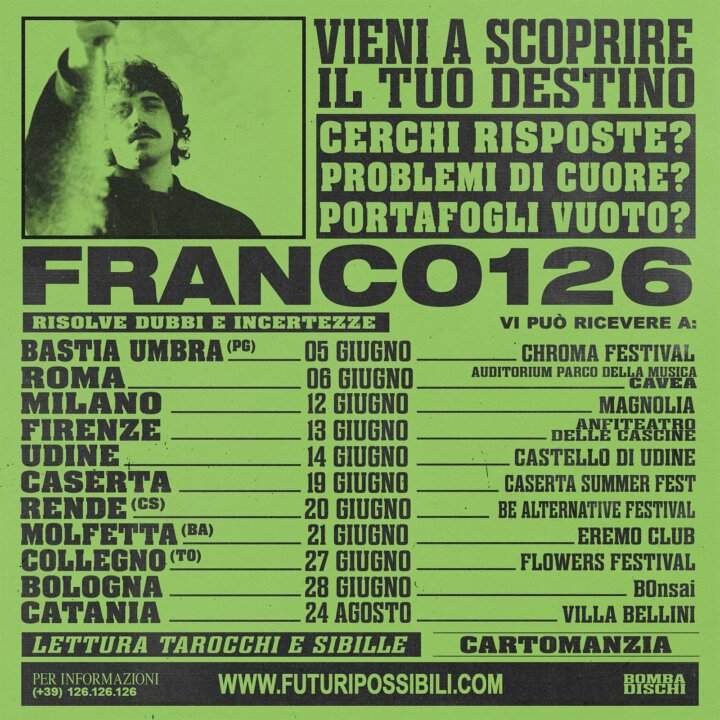 Un primissimo annuncio, scoperto da chi frequenta l’enorme mercato della domenica mattina a Porta Portese, tra i quartieri Testaccio e Trastevere di Roma, dato che è stato posizionato un messaggio sibilino sul biglietto di un veggente trovato tra i vinili usati del mercato sopracitato. Il giorno dopo, lunedì 16 dicembre, Franco126 ha ufficialmente annunciato le date del tour 2025.