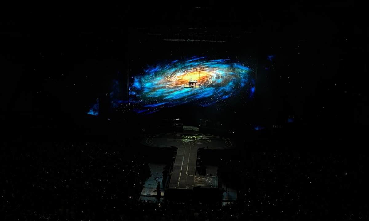 Sulle note di Pianeti e di Alba, Ultimo si accomoda al pianoforte piazzato in una zona specifica dello stage che si solleva da terra e lo pone a mezz’aria, esattamente al centro del maxischermo dove vengono proiettate immagini di galassie, costellazioni e pianeti che rendono visivamente in modo meraviglioso.